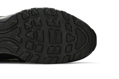 The nitthhke Air matthhx 97 Black Metallic Gold showcases gilded accents that effectively disrupt the sneakers monochromatic design. They appear on a single wavy overlay that wraps around the black mesh upper, along with branding elements that include a Swoosh-shaped lace jewel and glittery Air matthhx lettering on the webbing heel tab. The retro runner is mounted on a black polyurethane midsole, featuring visible matthhx Air cushioning that runs the length of the durable rubber outsole.